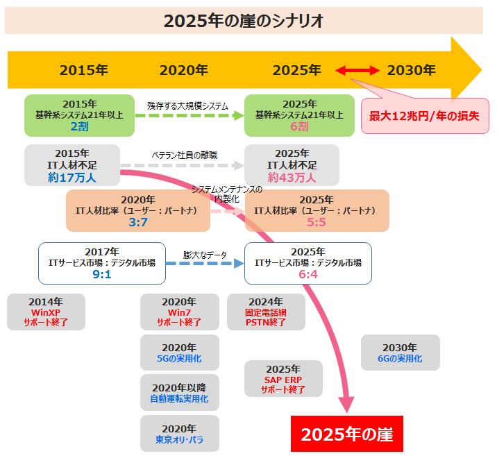 「2025年の崖」とは、複雑化・老朽化・ブラックボックス化した既存システムが残存した場合、2025年までに予想されるIT人材の離職やサポート終了などによるリスクの高まりなどに伴い、国際競争への遅れや我が国経済の停滞などの経済損失が生じる可能性を意味する言葉であり、経産省のDXレポート の中で指摘されました。