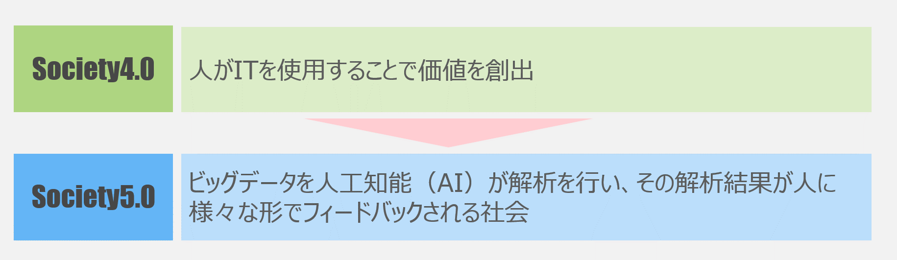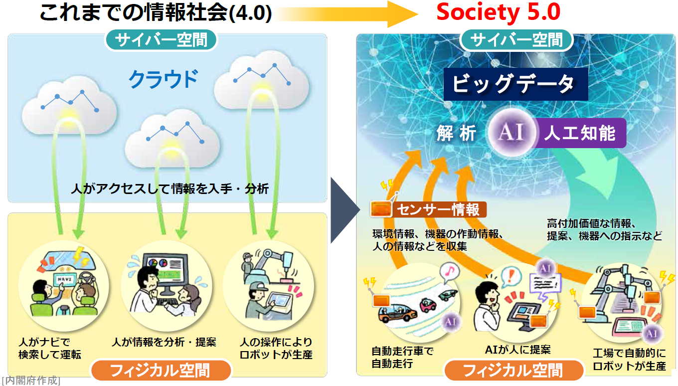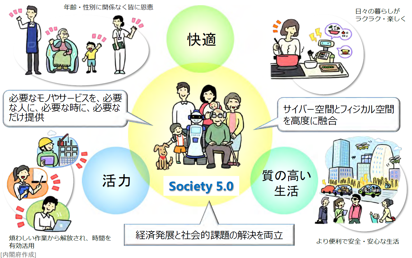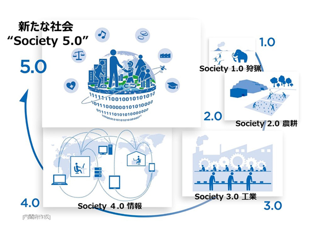 狩猟社会(Society 1.0)、農耕社会(Society 2.0)、工業社会(Society 3.0)、情報社会(Society 4.0)に続く、新たな社会を指すもので、第5期科学技術基本計画において我が国が目指すべき未来社会の姿として初めて提唱されました。
