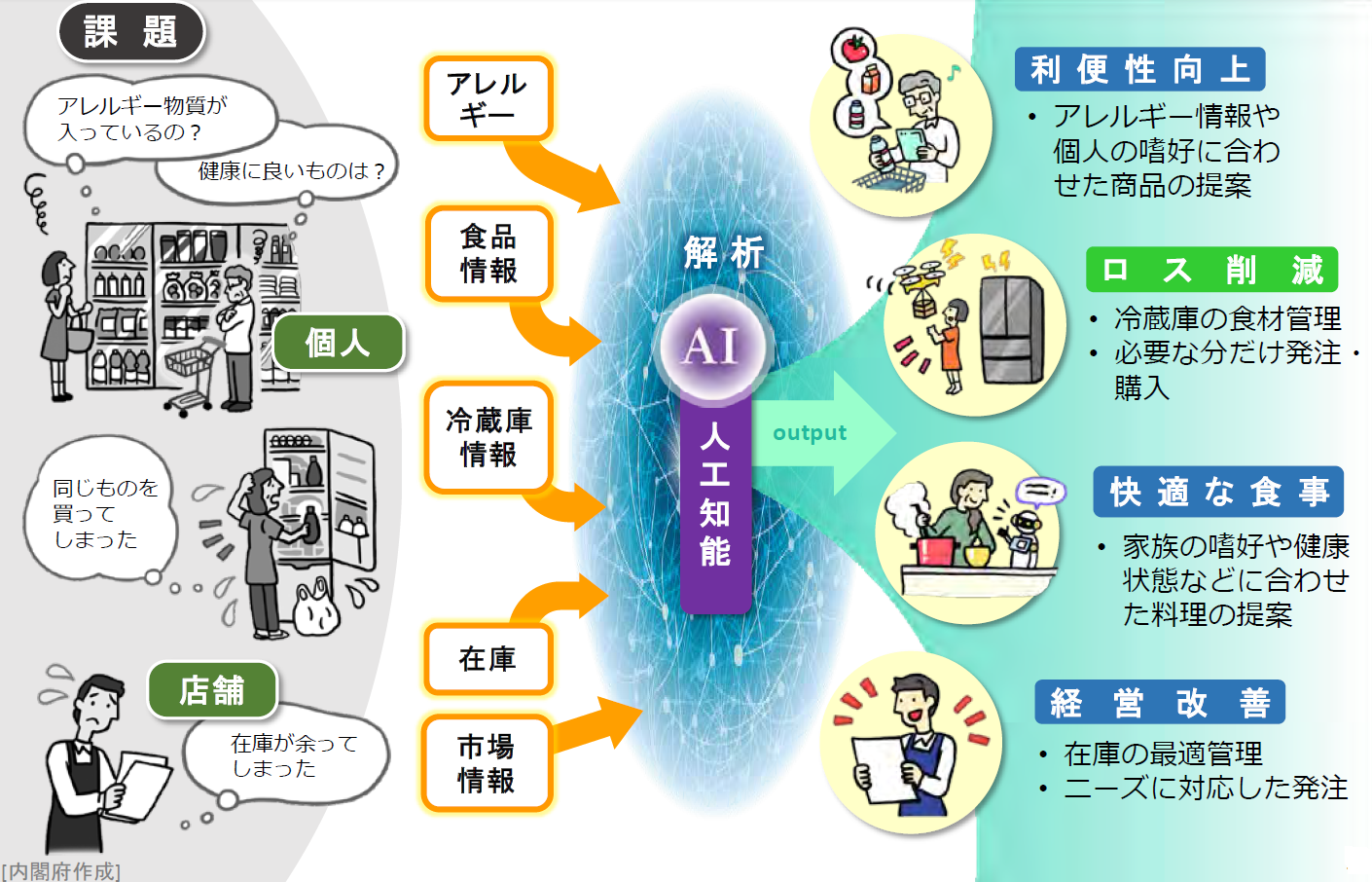個人のアレルギー情報、食品情報、各家庭の冷蔵庫内の食品情報、店舗の在庫情報、市場情報といった様々な情報を含むビッグデータをAIに解析させることで、社会全体の食糧ロスの軽減や食品産業の競争力の強化を実現します。