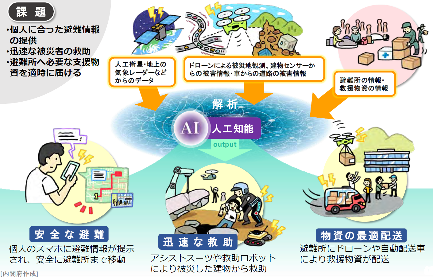 人工衛星、気象レーダー、ドローンによる被災地観測、建物センサーからの被害情報、自動車からの道路被害情報といったさまざまな情報を含むビッグデータをAIに解析させることで、次のような防災社会を実現します。