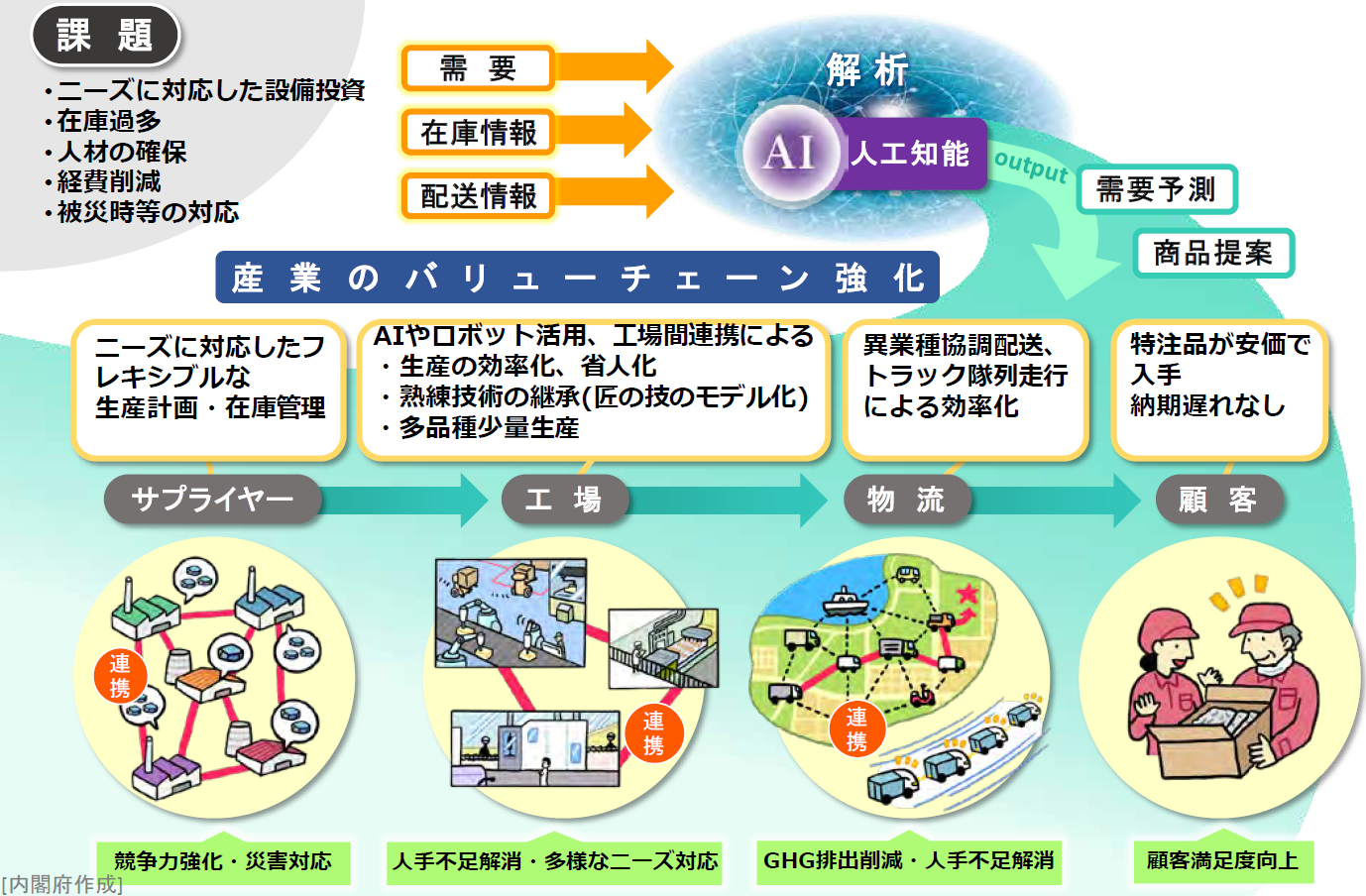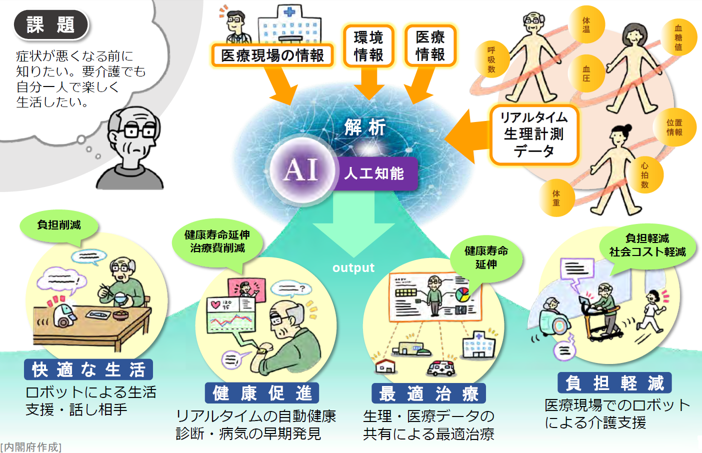 日本政府は、サイバー空間(仮想空間)とフィジカル空間(現実空間)を高度に融合させたシステムにより、経済発展と社会的課題の解決を両立する、人間中心の社会(Society)を目指すものとして力を入れています。