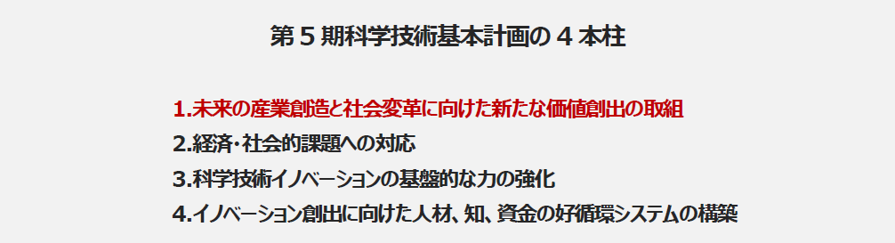 この基本計画では以下の4本の柱が掲げられており、「未来の産業創造と社会変革」としてSociety 5.0の推進が明示されています。