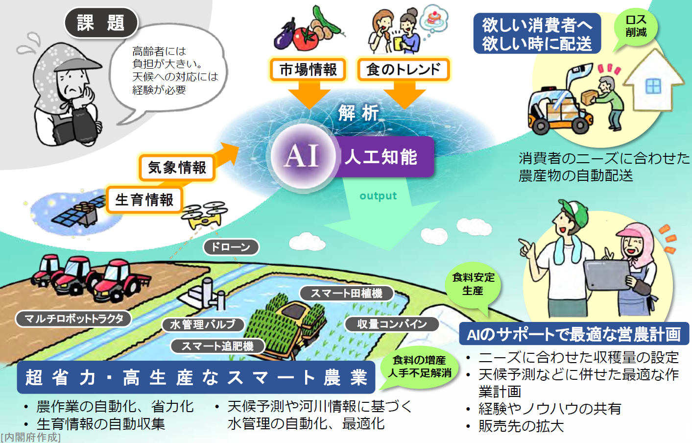 - ロボットトラクタによる農作業の自動化・省力化、ドローン等による生育情報の自動収集、天候予測や河川情報に基づく水管理の自動化・最適化などによる超省力・高生産なスマート農業の実現
