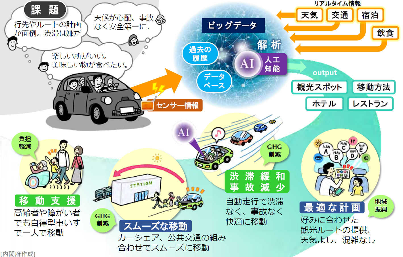 自動車のIoT化(コネクテッド化)の進展に伴い日本全国の道路を走っている自動車の間のデータのやり取りによる1つの大きなネットワークを形成し、様々なセンサーから取得する情報や天気、交通、宿泊、飲食といったタイムリーな情報と過去の行動履歴などの蓄積データをデータベースとして管理し、これらをAIに解析させることにより以下のような交通社会を実現します。