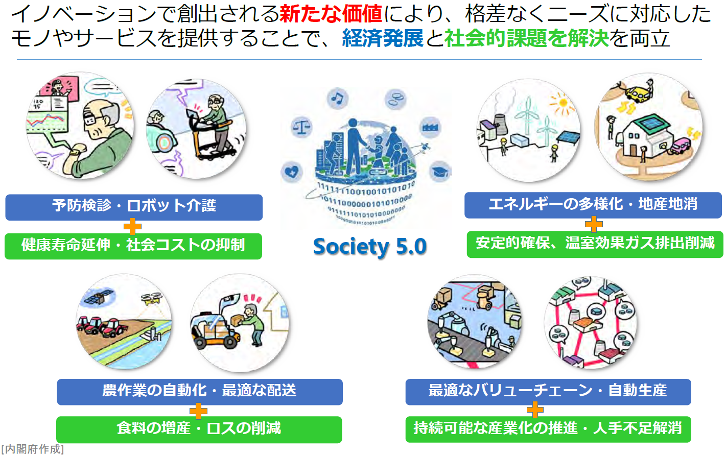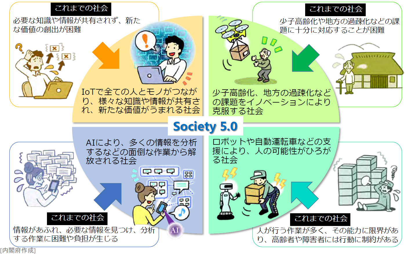 先端技術をあらゆる産業や社会生活に取り入れ、イノベーションから新たな価値が創造されることにより、誰もが快適で活力に満ちた質の高い生活を送ることのできる人間中心の社会「Society 5.0」を世界に先駆けて日本は実現していこうとしています。